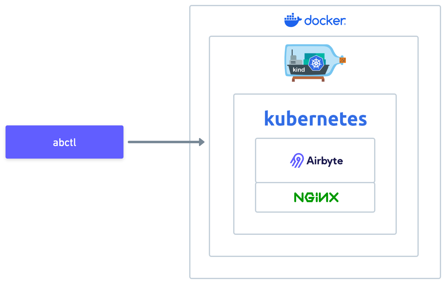 abctl uses kind to create a Kubernetes cluster inside a Docker container. Then, it uses Helm to install the latest Airbyte and NGINX Ingress Controller Helm charts. It also helps you manage and understand that infrastructure.